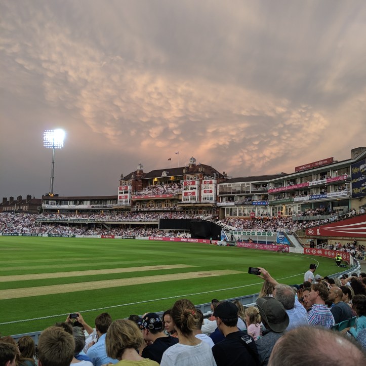 As the sun set, and the crowd enjoyed the spectacular clouds forming over the Pavilion, Surrey set to work on the Glamorgan bats. Jade Dernbach opened the bowling against the debutant Fakhar Zaman and bowled a mean over, limiting the visitors to five runs, David Lloyd dispatching Dernbach to the boundary on the final ball.